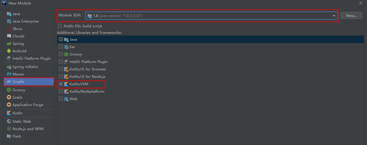 + 在创建页面选择 Gradle 构建工具,右侧上方,选择需要使用的 SDK,这里使用的是 Java 1.8 ,看自己的需求选择使用的 SDK,Frameworks 层选择 kotlin 这里没有什么争议的看自己使用的语言,使用Java 可以勾选 Java 或者勾选多个都是可以的,然后点击 next 下一步,进行下一页面操作