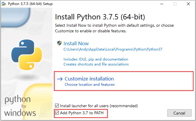 勾选“Add Python 3.7 to PATH”,点击“Customize installation”;