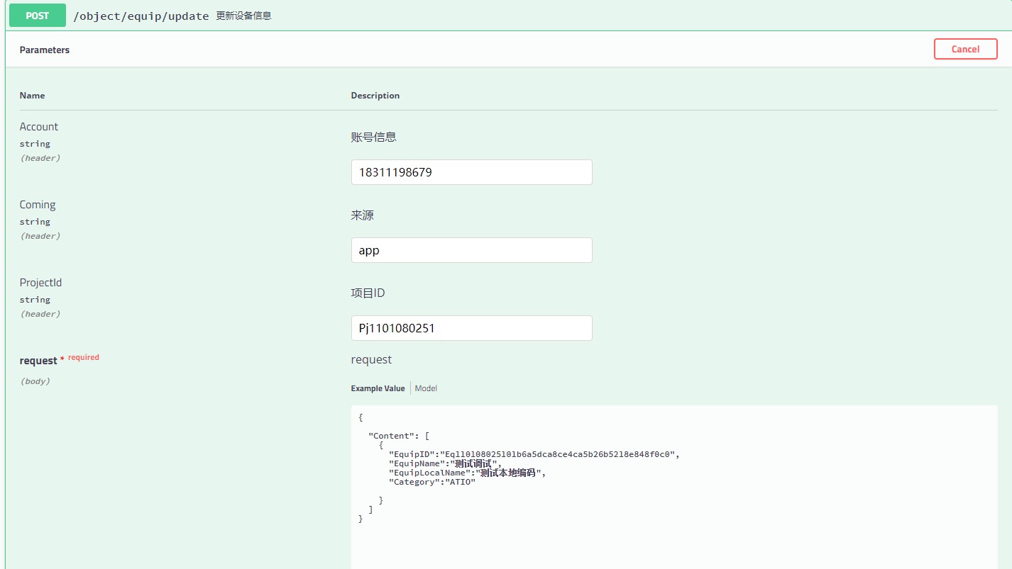 上面的例子中把 EquipLocalName 信息点的值置空,需要在 Projection 中指定置空的信息点以及需要更新的信息点 ,在操作置空的请求体重可以不传需要置空的信息点 只要在 Projection 中指定信息点的属性,就会把这个属性值置空 ,注意:更新是根据对象的主键进行数据更新,例如设备,一定要传设备id,否者更新失败,服务端会不知道要更新的是哪个对象